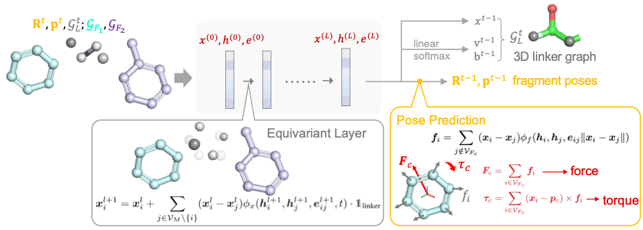 摘要:靶向蛋白质降解技术(TPD),例如蛋白水解靶向嵌合体(PROTAC),已成为选择性去除致病蛋白质的强大工具。该领域的一个具有挑战性的问题是设计一种连接体(Linker)来连接不同的分子片段以形成稳定的候选药物分子。现有的Linker设计模型均假设两侧的分子片段的相对位置已知,但在PROTAC的实际设计中,该假设并不成立。在这项工作中,我们解决了一个更普遍的问题,即假设分子片段在 3D 空间中的姿态未知,去设计能有效连接分子片段的Linker。为此,我们开发了一个 3D 等变扩散模型 LinkerNet来共同学习分子片段姿态和Linker 的图结构及3D结构的生成过程。其中,通过将分子片段视为刚体,我们受刚体力学中牛顿-欧拉方程的启发,创新性地设计了分子片段姿态预测模块。在 ZINC 和 PROTAC-DB 数据集的实验研究表明,我们的模型可以在无约束和有约束生成设置下均可以生成类药性和可合成更强,且能量更低的分子,为PROTAC中的Linker设计提供了一种有效的解决方案。