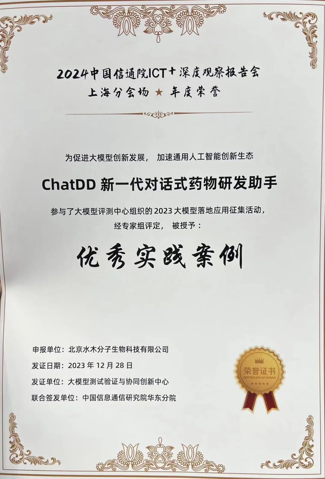 水木分子研发的“ChatDD新一代对话式药物研发助手” 作为唯一的生物医药大模型应用入选首部《2023大模型落地应用案例集》