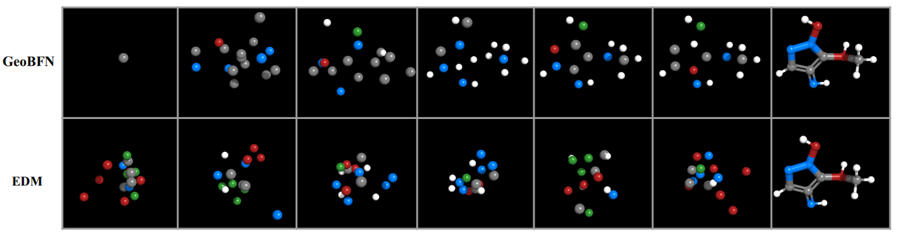 摘要:在本文中,课题组提出了几何贝叶斯流网络(GeoBFN)以一种和扩散模型从根本上不同的方式建模3D分子结构。贝叶斯流网络(BFN)通过采用独特的方法,结合贝叶斯推断来修改一组独立分布的参数,为几何生成建模带来了全新的角度。首先,GeoBFN对于分子几何结构中的不同模态采用了统一的概率建模方式;其次,关于3D原子坐标的建模,相比于扩散模型,贝叶斯流网络的输入方差显著较低,从而在对分子结构噪音敏感性上有更好的兼容性。此外,通过等变的依赖关系模块将几何对称性引入贝叶斯更新过程中。本文进一步证明了GeoBFN在概率建模上的SE-(3)不变性以及迭代更新的生成方式具有旋转平移等齐性;第三,利用BFN强大的概率建模能力,3D分子几何表示可以进一步优化为仅具有两个更加接近的模态表示:离散整数的电荷和连续的原子坐标。针对原本BFN对于连续整数变量生成存在的模式冗余问题,本工作在GeoBFN提出了早期模态搜寻的策略进行解决。借助于在方差较小的空间中操作,GeoBFN可以以任意步数进行采样,从而提供效率和质量之间的最佳权衡,如在保持和之前方法质量一致的前提下实现了20倍的加速。此外,GeoBFN是一个通用框架,可以轻易地扩展到其他分子任务。 文中对GeoBFN在多个基准测试上进行了全面评估,包括无条件和有属性条件分子生成任务。结果显示GeoBFN在分子稳定性和其他指标上始终取得了目前最佳生成性能。实证研究也表明在可控生成方面有明显的改善,并表明GeoBFN具有显著更高的建模能力和推理效率。