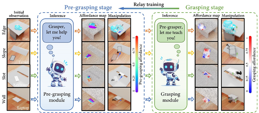 AIR 助理教授赵昊引领我对预抓取相关文献展开了为期两周的深入调研,最终确定了名为 PreAfford 的技术方案。此方案极具开创性,能够把预抓取的应用范围拓展至不同类型的物品以及四种地形,是首个可在实际机器上部署的通用预抓取算法。