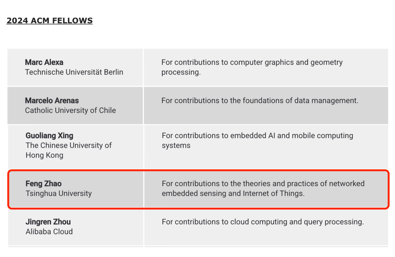 (AIR)首席科学家赵峰教授当选 ACM Fellow,以表彰他为计算机科学领域网络嵌入式感知和物联网的理论和实践做出的贡献。(For contributions to the theories and practices of networked embedded sensing and Internet of Things.)