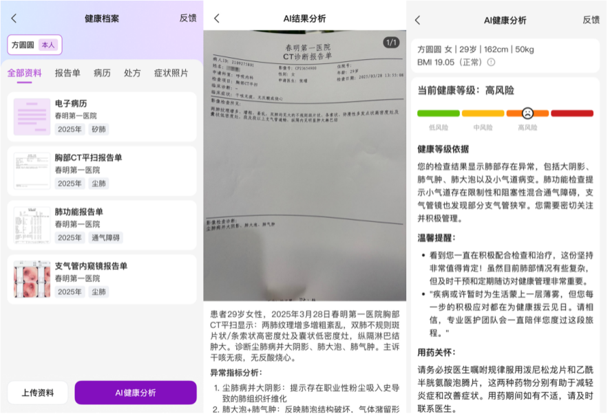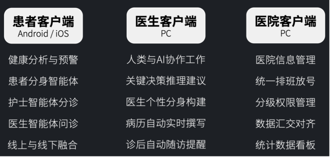 患者客户端将为患者提供:1) 个人健康档案管理,结合历史检查信息为患者提供健康分析预警等功能;2) 患者分身智能体服务,在患者允许的情况下利用智能体完成基本的信息整理提供给医生,提升就诊效率;3) 护士智能体分诊,基于患者的初步症状输入,为患者提供合适的医院科室就诊建议;4) 医生智能体预问诊,等待接诊过程中医生智能体自动收集患者信息,改进医患交互体验。此外,系统将不断提升线上线下融合程度,改进用户诊疗和健康管理体验。