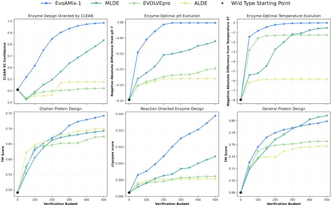 我们在多个代表性蛋白质定向进化任务上系统验证了 EvoAMix-1 的通用性和可扩展性,覆盖从功能调节到结构对齐的不同目标,包括酶的最适 pH 和温度进化、功能保持与增强、孤儿蛋白设计,以及通用的结构引导优化。实验结果显示,EvoAMix-1 在所有任务上展示出强劲的扩展能力,同时也体现其跨任务、跨目标的强大通用性。无论是功能属性优化,还是高保真结构生成,我们的方法都能稳定提升设计质量,验证了推理时动态优化机制的广泛适用性与有效性。