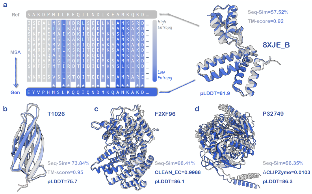 AMix-1 用一个通用的上下文学习框架完成了结构和功能导向的蛋白设计:(a-b)在结构任务上,以常规同源蛋白甚至在近乎无同源的“孤儿蛋白”为提示,AMix-1生成在预测结构上高度一致的新蛋白;(c-d)在功能任务中,AMix-1在输入蛋白的酶学功能和化学反应引导的酶设计上,AMix-1能生成出功能高度一致的蛋白酶。