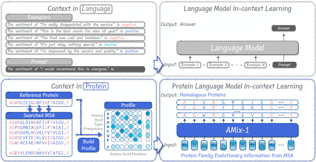 传统蛋白质设计往往需要根据任务类型进行定制流程,设计导向不同往往算法流程也不同,缺乏统一的蛋白设计框架。而 AMix-1 引入了大语言模型中的 In-context Learning(ICL)机制,给出了一个通用而强大的方法:给模型一组目标性质蛋白质,让它自己理解规律、运用规律,最终设计出具备相似能力的蛋白质。