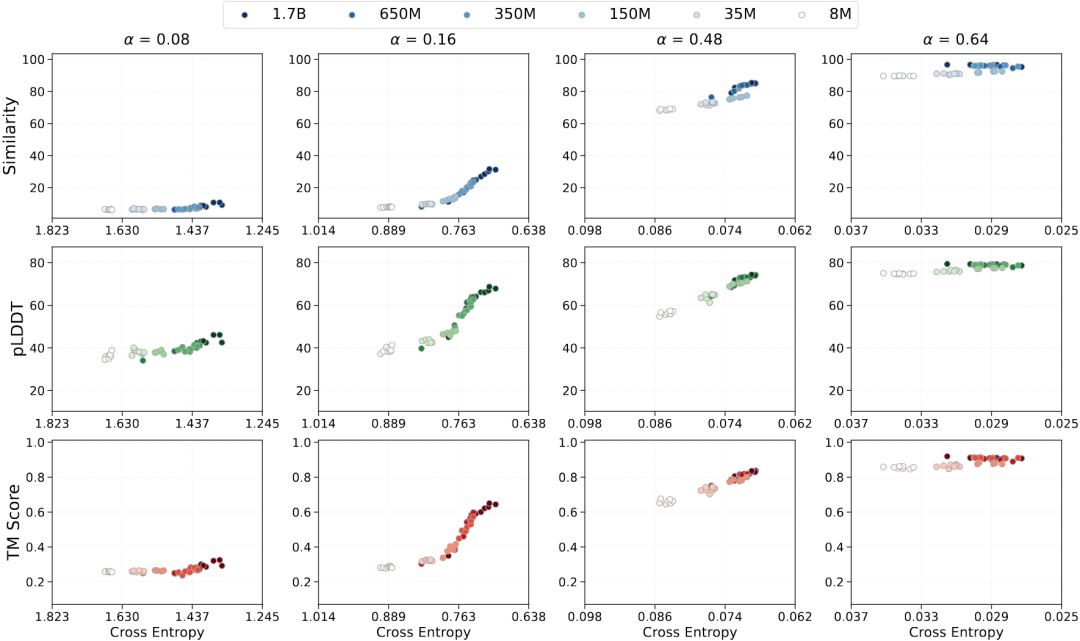 能力的涌现受目标函数驱动。在训练过程中,我们发现所有能力指标与交叉熵损失呈高度相关性——只要 loss 足够低,能力便会“自动”出现。这一规律使得通过scaling law 和 loss 预测模型能力成为可能。更为关键的是,即便模型仅以序列级自监督目标训练、完全不引入结构信息,它依然在 loss 下降至某阈值后突然表现出结构感知能力,表现出 pLDDT 与 TM-score 的非线性跃迁。这种“涌现”并非渐进,而是明确的跳变。