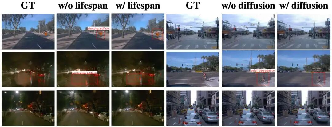 Lifespan head 的作用在图3中的消融对比非常直接:去掉 lifespan 后,PSNR 从 27.41 降至 24.21,原因在于系统失去了对静态区域在时间维度上的细微变化(如亮度、反射、阴影过渡等)的建模能力。世界坐标静态的地方一旦无法随时间正确更新,就会破坏渲染的时空一致性与真实感,从而显著拉低最终画面质量。