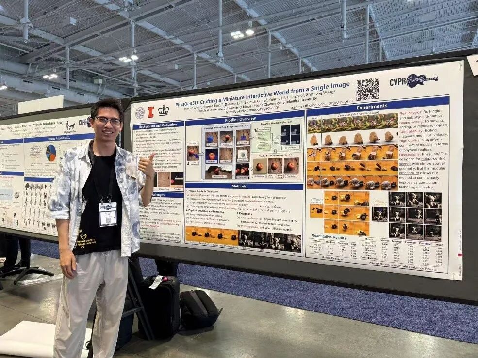 之后在赵老师的帮助下,我获得了赴美国UIUC进行暑期研修的机会,并于2024年暑假加入王申龙老师课题组开展科研工作。这是我首次从选题阶段便完全自主推进的项目。在与两位导师深入探讨后,我选定了一条相对非主流的研究方向——基于重建与仿真的方法,从单张图像可控地生成视频。当时主流的视频生成模型难以保证生成结果符合物理规律,因此我尝试以仿真为基础,探索一条不同的技术路径。