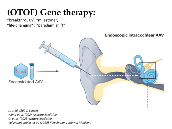 为了说明BCI+GE的发展前景,曾教授分享了一个极具震撼力的基因治疗耳聋的临床案例:某些先天性耳聋患儿携带 OTOF 基因突变,导致耳蜗内关键蛋白缺失,听神经不能正常传递信号。过去,这类病人只能依赖人工耳蜗来“绕过”损坏的生物环节;而在 2024–2025 年间,国内团队(东南大学、复旦大学等)率先在人体上开展了基因治疗临床试验:通过 AAV(腺相关病毒)载体,将健康版本的 OTOF 基因“一针打入内耳”。病人原本需要依赖人工耳蜗的一侧,在打针数月后,自然听力部分恢复。