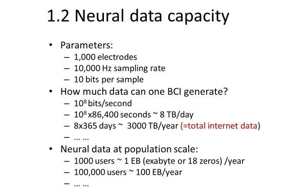 针对人类的神经数据容量,曾教授进行过估算:一个人 + 一套高通量 BCI,一年产出的神经数据量,已经与整个互联网的高质量数据同一量级。具体来说:当前一代高通量 BCI约 1024 个电极;采样率约 10 kHz;动态范围约 10 bits。粗略估算:每秒记录的数据量:约 (10^8) bits;一天可产生约 8 TB 数据一年就是约 3000 TB(3 PB)数据。这还只是来自一个人的一套 BCI 设备。如果未来有成千上万名病人或志愿者长期植入 BCI,并持续记录数据,那么神经数据的总量将轻松达到 Exabyte(EB)级,远超现有任何公开数据源,相比之下,人类可用的高质量互联网数据也不过几百 TB 级别。