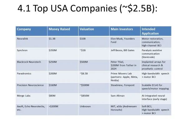 梳理公开信息可以发现,美国的AI巨头押注 BCI 与基因工程,Neuralink融资约 13 亿美元,估值在数十亿美元量级,主要出资人就是 Elon Musk;Synchron的早期投资者包括 Jeff Bezos、Bill Gates;Blackrock Neurotech的早期天使投资人包括 Peter Thiel;Sam Altman 也以个人身份投入了新的 BCI 创业公司(如 Merge Labs 等)。他们背后的共同逻辑是:想让人类活得更长、活得更好、活得更舒服;同时,在下一场技术革命中抢占平台级入口与数据源的制高点