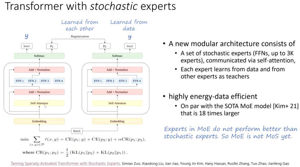 在模型架构上,高教授团队提出了Transformer with Stochastic Experts [4]。该工作参考了专家网络(Mixture of Experts,MoE)的思路,为Transformer模型设计了不同的前馈网络(Feed Forward Network)子结构作为随机专家(stochastic experts),它们之间通过自注意力机制进行交互。每个专家可以从数据中学习,也可以从其它专家上进行学习。该方法能够在参数更少的情况下与最先进的专家网络方法取得可比的结果。