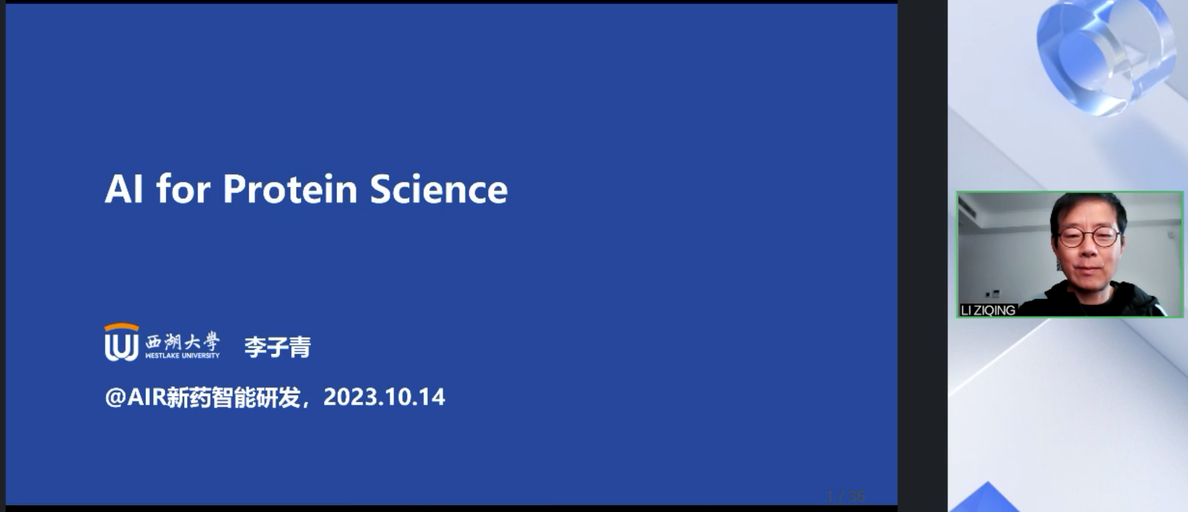 10月14日,第5期AIR学术工作坊第四位嘉宾:西湖大学人工智能讲席教授教授李子青,在线上为我们做了题为《AI for Protein Science》的报告。