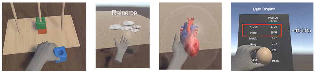此外,手套还可以用于模拟患者的MRI和CT扫描结果,让医生通过触觉感受患者心脏和肝脏的健康状态。它还为卧床和活动不便的患者提供了与家人和朋友互动的新方式,有助于情绪困扰和治疗抑郁。手套与多种头显(如HoloLens、Meta Quest 3、VIVE Focus 3)兼容,主要有两个核心技术。这款手套集成了柔性可拉伸的应变传感器和小型轻量的气动触觉反馈模块,前者用于做快速准确的手指运动捕捉,而后者则使用者感受到物体的软硬程度、心脏的跳动等。这款手套应用于多种虚拟场景的软件开发中,包括按压按钮、软硬分辨、堆叠积木、心跳、雨滴、气球和射箭等。这些应用不仅展现了手套在提供多样化触觉体验方面的能力,也证明了其在教育、培训和娱乐等多个领域的巨大潜力。