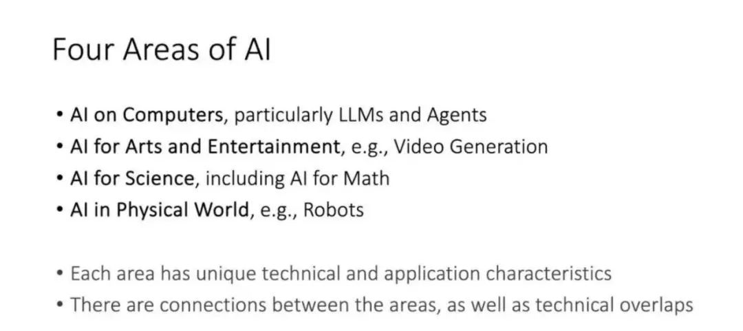 李航博士认为,根据技术特点和应用场景,AI的研究主要分为四个大方向,分别是AI on Computers,AI for Arts,AI for Science和AI in Physical World。前两个更贴近目前的产品,后两个是未来的探索方向。