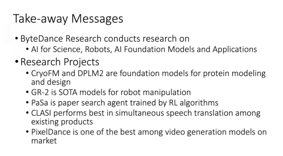 字节跳动的AI研究定位聚焦于AI基础场景,研究领域广泛,涉及机器人、负责任AI、AI大模型和agent等基础技术。在全球范围内,字节跳动组建了多个研发团队,分布于北京、上海等地,并且积极与像b站