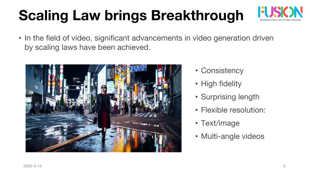 探讨了Scaling Law对生成模型效果的突破性影响,特别是在大规模模型训练中,如何通过增大模型的规模和数据量来提升生成效果。朱博士提到随着生成模型规模的增大,效果的提升是显著的,以Sora为代表的模型通过巨大的训练数据集和更深层次的网络结构,在生成一致性和连贯性上取得了优异的成绩。然而朱博士也指出,尽管Scaling Law带来了性能上的提升,是否能够真正模拟世界层面的物理规律仍然存在争议。生成的视频或图像虽然在视觉上能够逼真还原,但其物理属性、动态性以及与外部环境的交互性仍然有待加强。