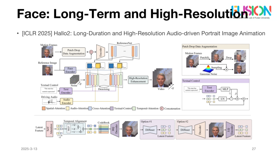 朱博士团队也在探索如何通过语音控制生成的人脸模型。团队采用基于UNet的去噪模型,并将输入的语音信息与人体先验进行结合,从而控制人脸生成模型的动作和表情。这一方法在提升生成效果的同时,也能更好地将语音与面部运动之间的关系建模,增强生成视频的自然感和连贯性。针对长时间视频生成的问题,团队还采取了一些优化策略,以解决Diffusion模型中误差累积的问题。通过这些创新的改进,视频生成模型成功地生成了较长时间的视频,并有效避免了生成过程中的质量退化。