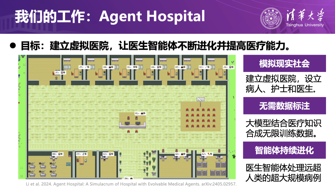 团队在虚拟空间里构建了一座流程完整的数字医院:患者从发病、分诊、挂号、问诊、检查到康复,形成一个闭环;医院涵盖二十多个科室、上千种疾病,既有带人设的 AI 患者,也有依据不同指南训练出的多类 AI 医生;时间在虚拟世界中被大幅加速,AI 医生可以在“虚拟两年”(现实一两天)的时间里看上万名病人,在成功与失败中持续积累经验并不断演化。