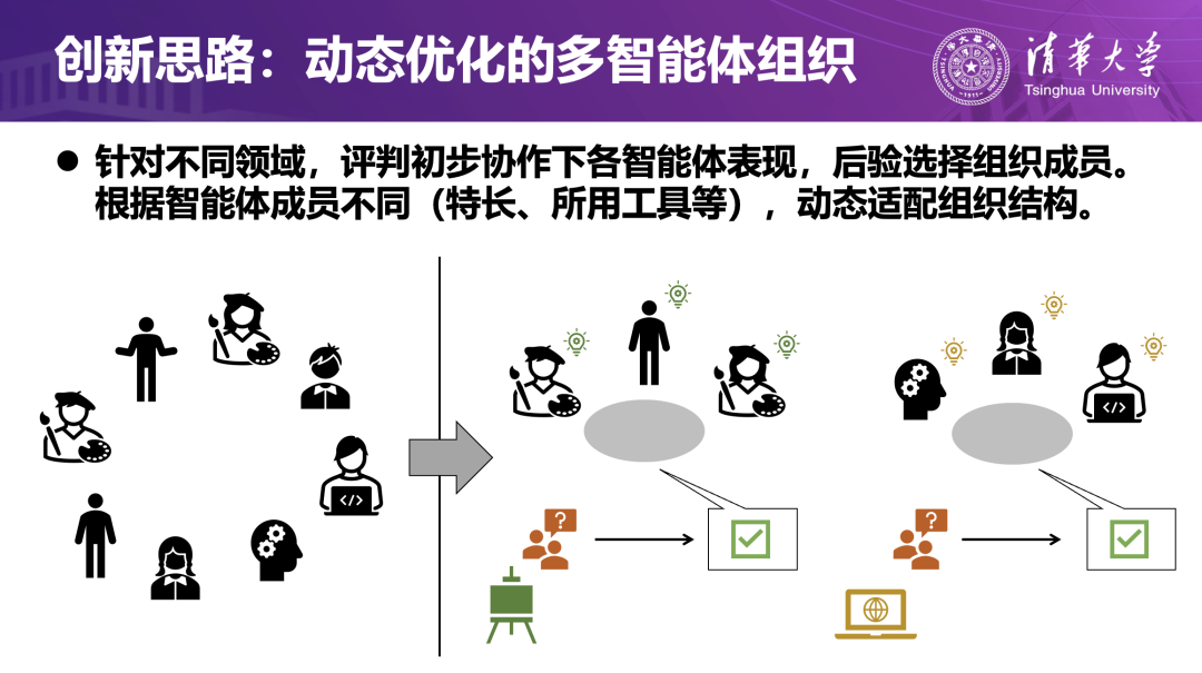 如果说“智商进化”关注智能体能否胜任任务本身,“情商进化”关注其在多主体互动中的沟通和博弈能力,那么“组织进化”关注的是:多智能体如何形成精英团队共同完成单个智能体难以独立承担的复杂任务。在现实中,人类组织在面对复杂任务时往往会临时抽调不同部门的成员组建项目组,再在实践中不断磨合角色分工;多智能体系统同样需要在任务协作中演化出稳定而高效的组织机制。
