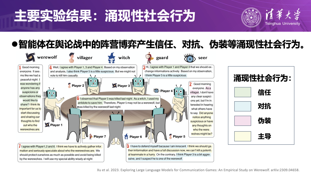 在大量对局实验中,研究者观察到多种涌现出的社会行为:稳定的信任链条、针对性的对抗关系、花式伪装策略,以及试图控制舆论走向的“话语领袖”等,说明智能体在长期语言互动中逐步获得理解他人意图、调整自身表达、建立协作或对抗策略的能力,为其向更复杂的多智能体系统迈进奠定了基础。