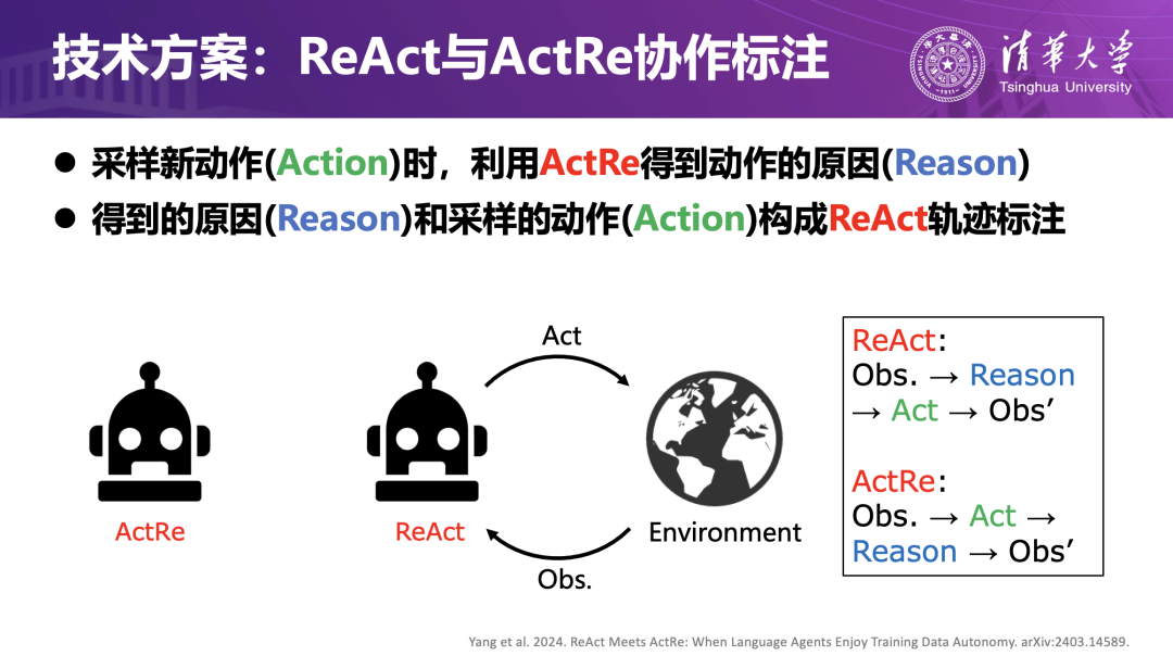 为了解决高质量交互轨迹难以获取的问题,团队在ReAct算法基础上提出ActRe框架,使智能体在执行任务的过程中自动生成可学习的数据。传统 ReAct 虽然能在推理阶段给出“思考—行动”链条,但其动作(Action)的合理性并未得到系统性的标注与校准,难以直接作为训练样本使用。ActRe 的引入,使智能体能够在采样新动作时由模型生成动作背后的“原因”(Reason),将“观察—思考—动作”的过程打包成可学习的交互轨迹;再利用这些自标注轨迹进行对比学习,强调成功轨迹,弱化失败轨迹,不断优化策略。