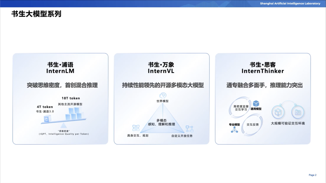 书生大模型体系自2021年底启动,逐步形成了覆盖语言、多模态、推理等多方向的完整布局。代表性成果包括语言模型“书生·浦语”、多模态模型“书生·万象”、推理模型“书生·思客”等,并在2025年发布了具有全球领先水平的科学多模态大模型Intern-S1。