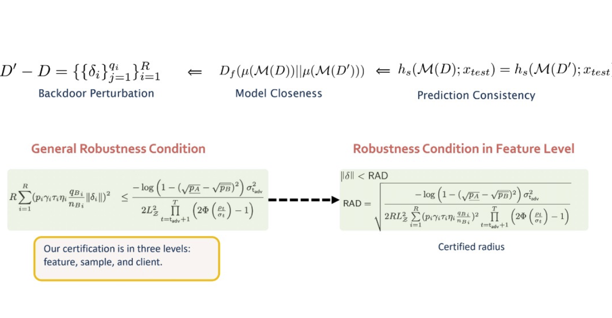 李博教授提出在联邦学习的训练过程中可以提供可验证性。其中如果攻击者对模型更新能够造成的扰动在一个限定的范围里面,则模型仍然可以提供一定的可验证鲁棒性。通过整合后门攻击扰动,模型间距离以及模型预测一致性,李博老师团队成功证明在特征水平上的鲁棒性条件,即只要攻击者所造成的扰动小于一个阈值,模型在输出上就能保证一致性。