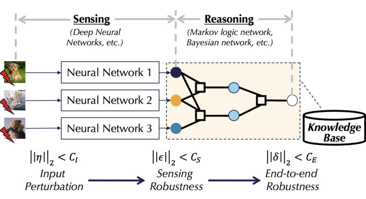李博教授团队提出感知-推理机器学习(Sensing-Reasoning ML Pipeline), 是一种端到端的机器学习流程,可以通过基于知识库的逻辑推理来提升网络的可验证鲁棒性。其中深度神经网络作为感知的部分来提取特征,之后经由推理网络整合特征之间的逻辑来达到最终预测。