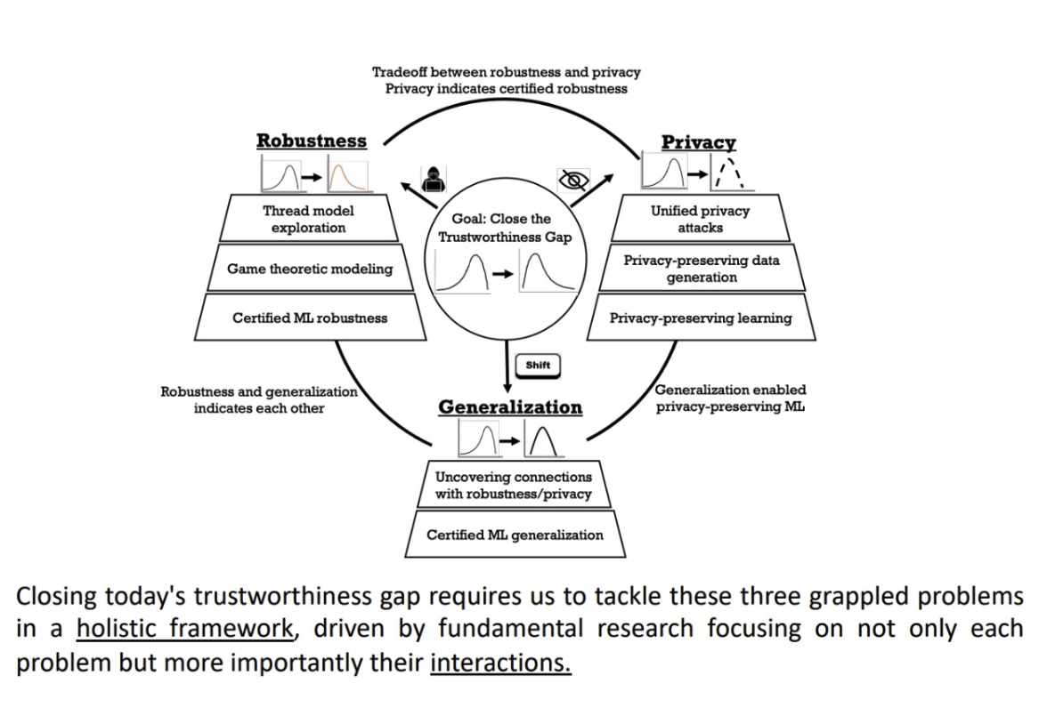 李博教授团队以研究在真实世界可应用的可验证的鲁棒性(Certified Robustness),隐私以及可解释机器学习为主,以应对可能出现在机器学习流程中各个方面的攻击。