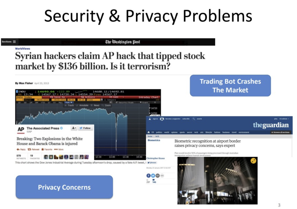 近年来,机器学习在真实世界诸多方面都有着广泛的应用,例如,自动驾驶,健康医疗,智慧城市等。虽然机器学习和人工智能强大且便捷,但是真实世界中机器学习的安全与隐私所涉及到的问题依然引起了人们的担忧。就在2016年,推特由于遭到黑客攻击释放出了白宫遇袭的消息。这些对公众来说显而易见的假消息,却使得基于机器学习的算法做出了错误的决策,在短短的几秒钟内交易了1360亿美金的股票。除此之外,澳大利亚的航空公司也开始使用人体的生物信息来进行身份识别,同样引发了公众对隐私泄露的担忧。基于机器学习隐私和安全等方面的可信机器学习的研究已经成为一个重要的课题。