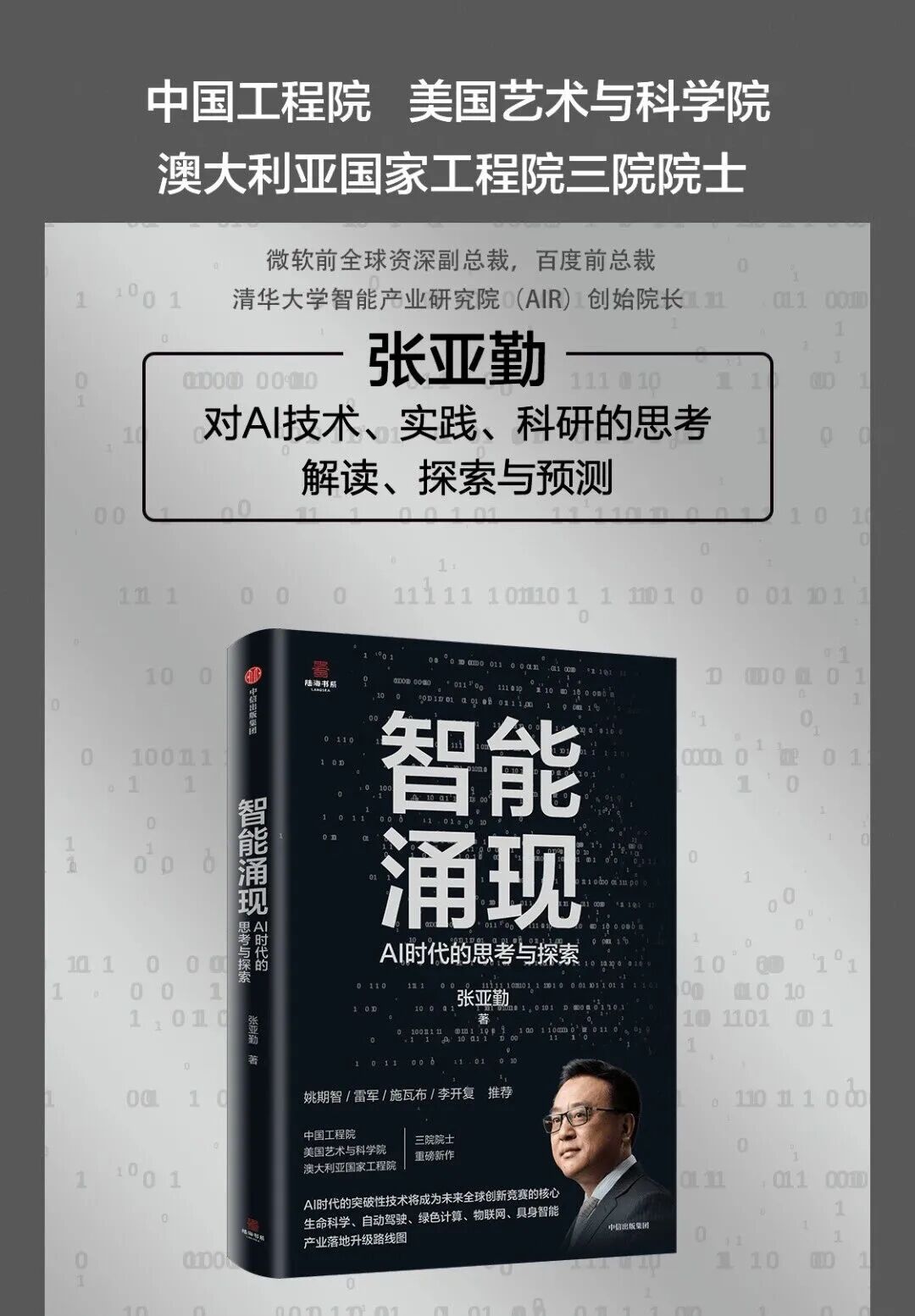 (AIR)张亚勤院长重磅推出《智能涌现:AI 时代的思考与探索》。当下,人类正处于百年未有之大变局,人工智能深刻改变着世界。张亚勤在书中呈现了他对世界进入信息智能、物理智能、生物智能相互融合创新周期的最新判断,以及对大模型、ChatGPT、DeepSeek 等最新技术与未来